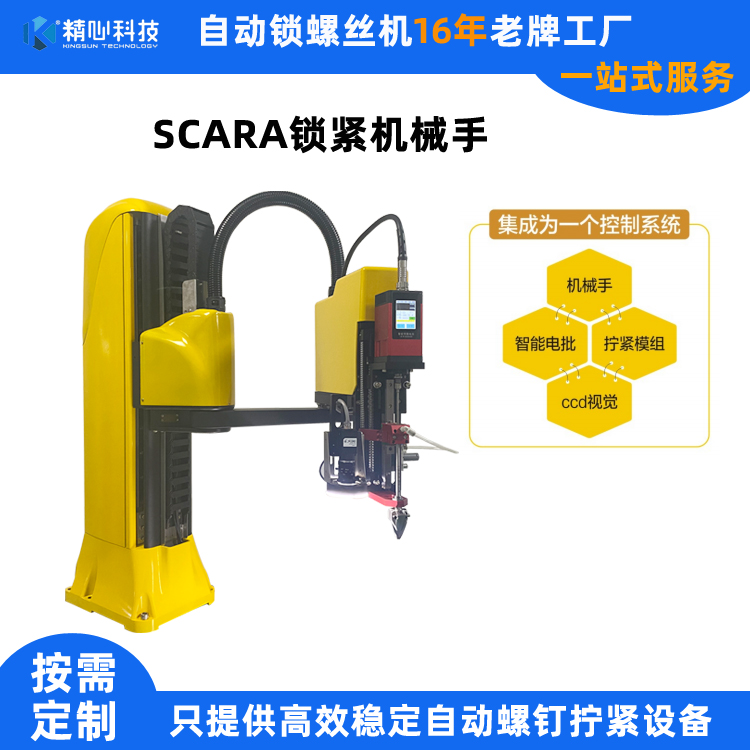 精心科技16年來一直專注螺釘鎖緊、輸送領(lǐng)域。經(jīng)過不斷的研發(fā)創(chuàng)新,將機(jī)械手、智能電批、擰緊模組和CCD視覺檢測集成為一個(gè)控制系統(tǒng),在簡便設(shè)備的操作使用的同時(shí)還能精準(zhǔn)高效的鎖附螺釘。通過單元間的配合使用,鎖緊機(jī)械手可以適用更多的尺寸和應(yīng)用場景。精心科技鎖螺絲機(jī)械手擁有先進(jìn)的自主學(xué)習(xí)功能,讓操作變得更加簡單。